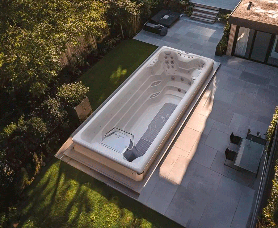 La nostra Swim Spa crea l'equilibrio ideale tra esercizio e relax, catturando perfettamente il movimento fluido e continuo dell'acqua.