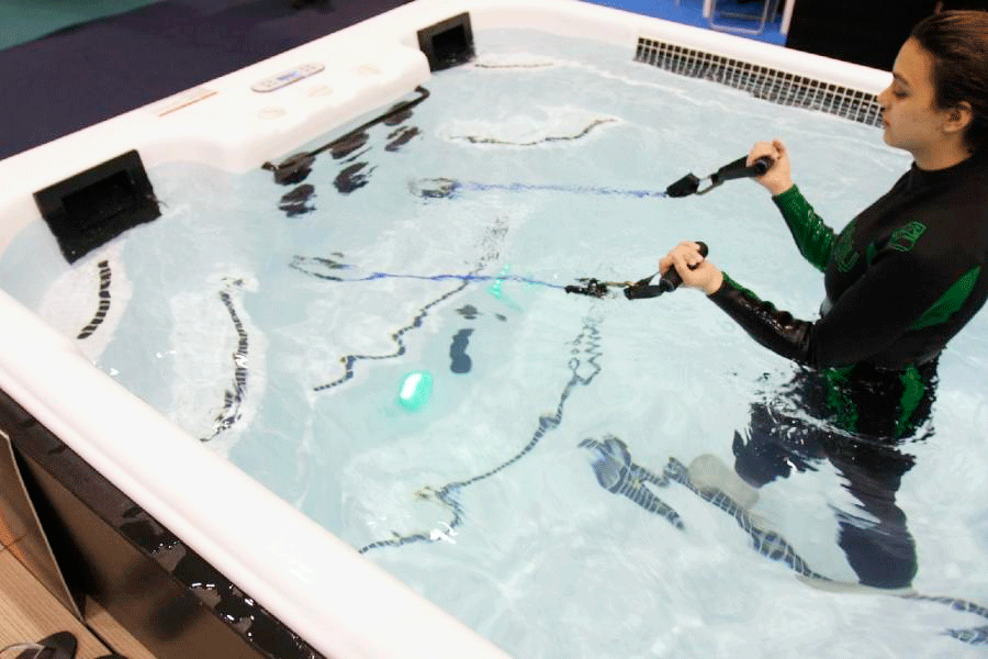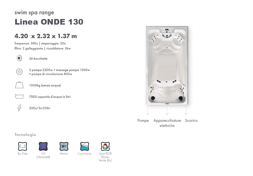 Onda 130 è una swim spa che combina i benefici dell’esercizio fisico con quelli dell’idroterapia, offrendo un’esperienza completa di benessere e performance. Utilizzabile tutto l’anno, in qualsiasi stagione, permette non solo di nuotare controcorrente, ma anche di camminare, correre o integrare una bicicletta subacquea per un allenamento completo a basso impatto.