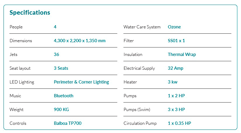 Wave 430 include potenti getti, giochi d'acqua e luci a LED. Utilizzando 3 pompe da 3 HP nella sezione nuoto, la pressione del getto è potente e quindi l'idroterapia è eccezionale. Ciclisti professionisti condividono i benefici dell'idroterapia dopo l'allenamento.